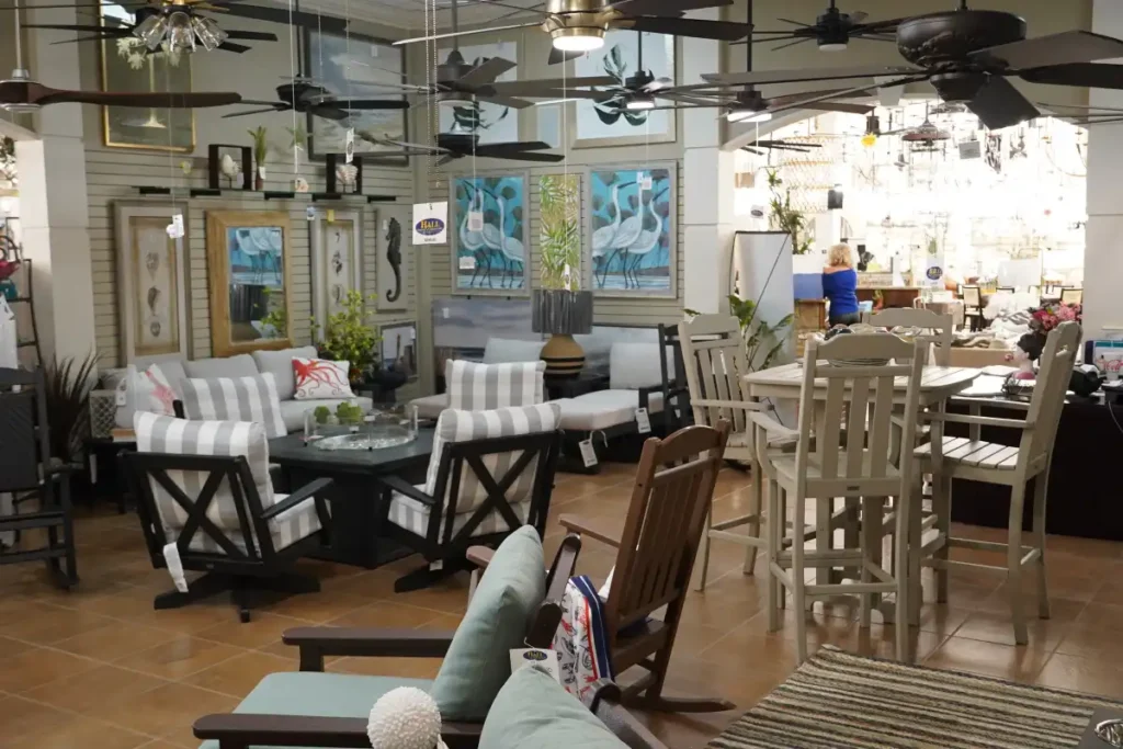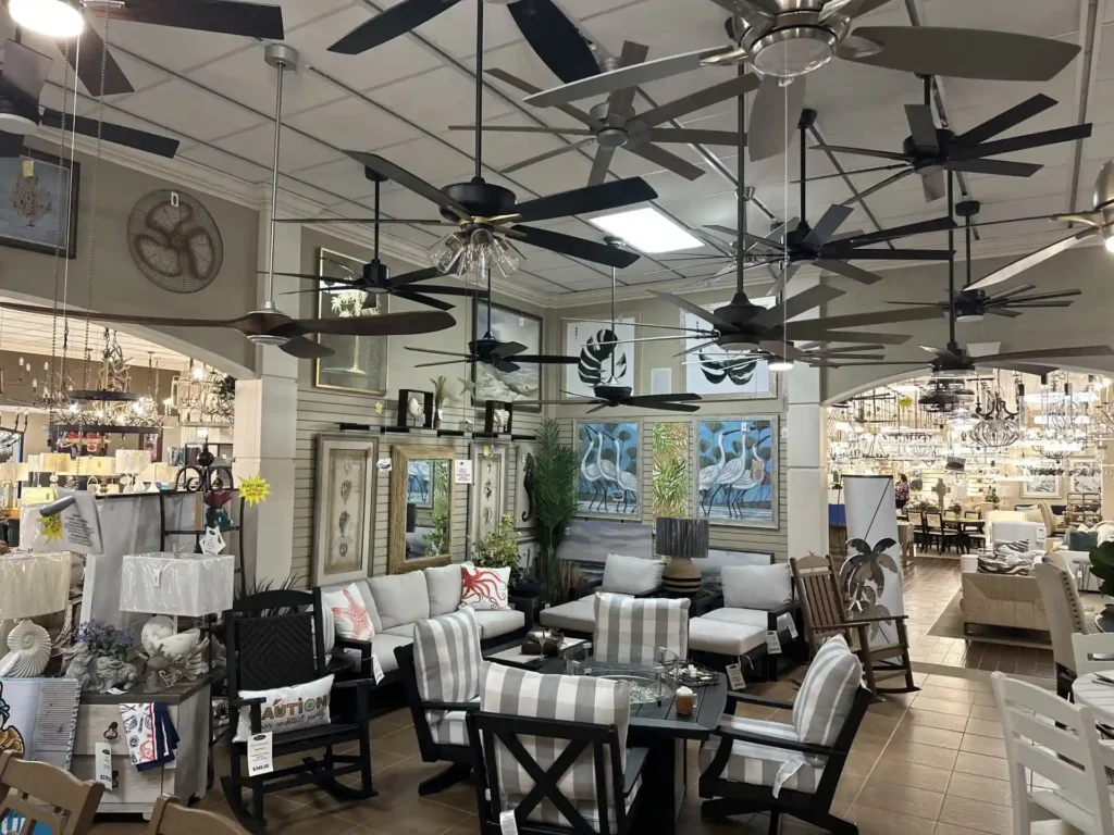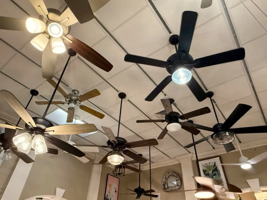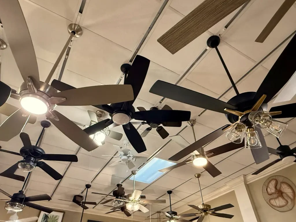 Inside our showroom, dozens of ceiling fans are installed and running so you can experience them the way they’ll work in your home. Stand beneath them to feel the airflow. Listen to how quietly (or not) they operate. See how the blades look at different speeds and how the lighting performs.